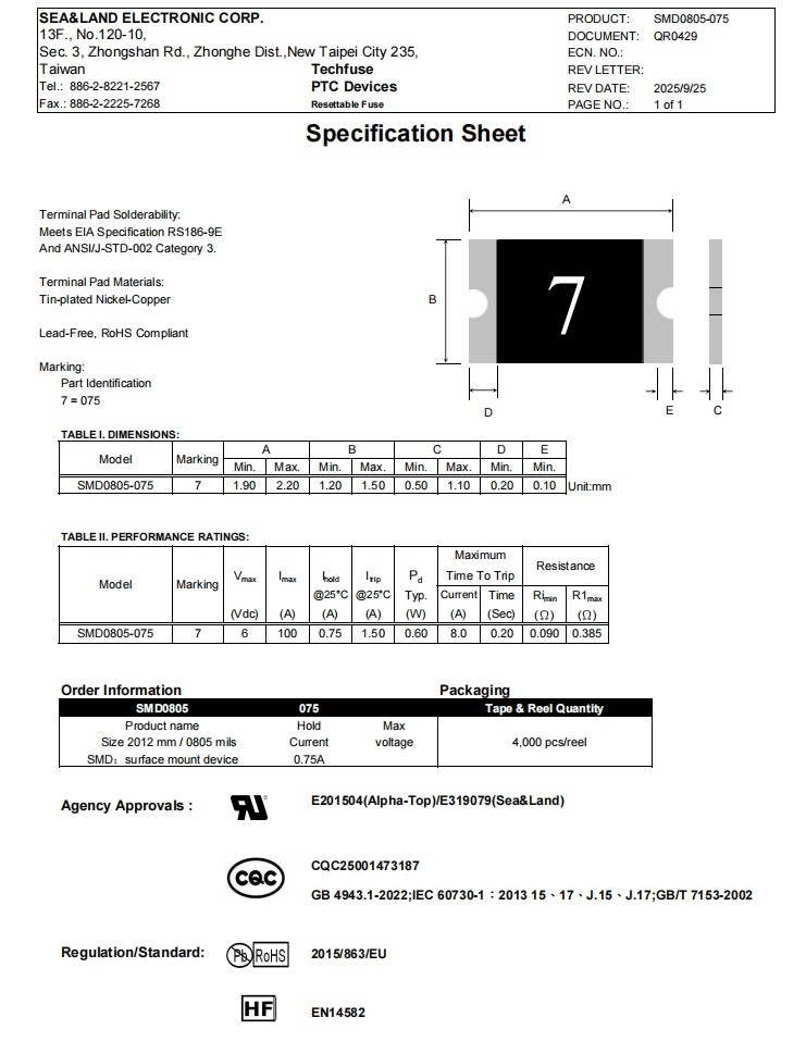 型号:SMD0805-075